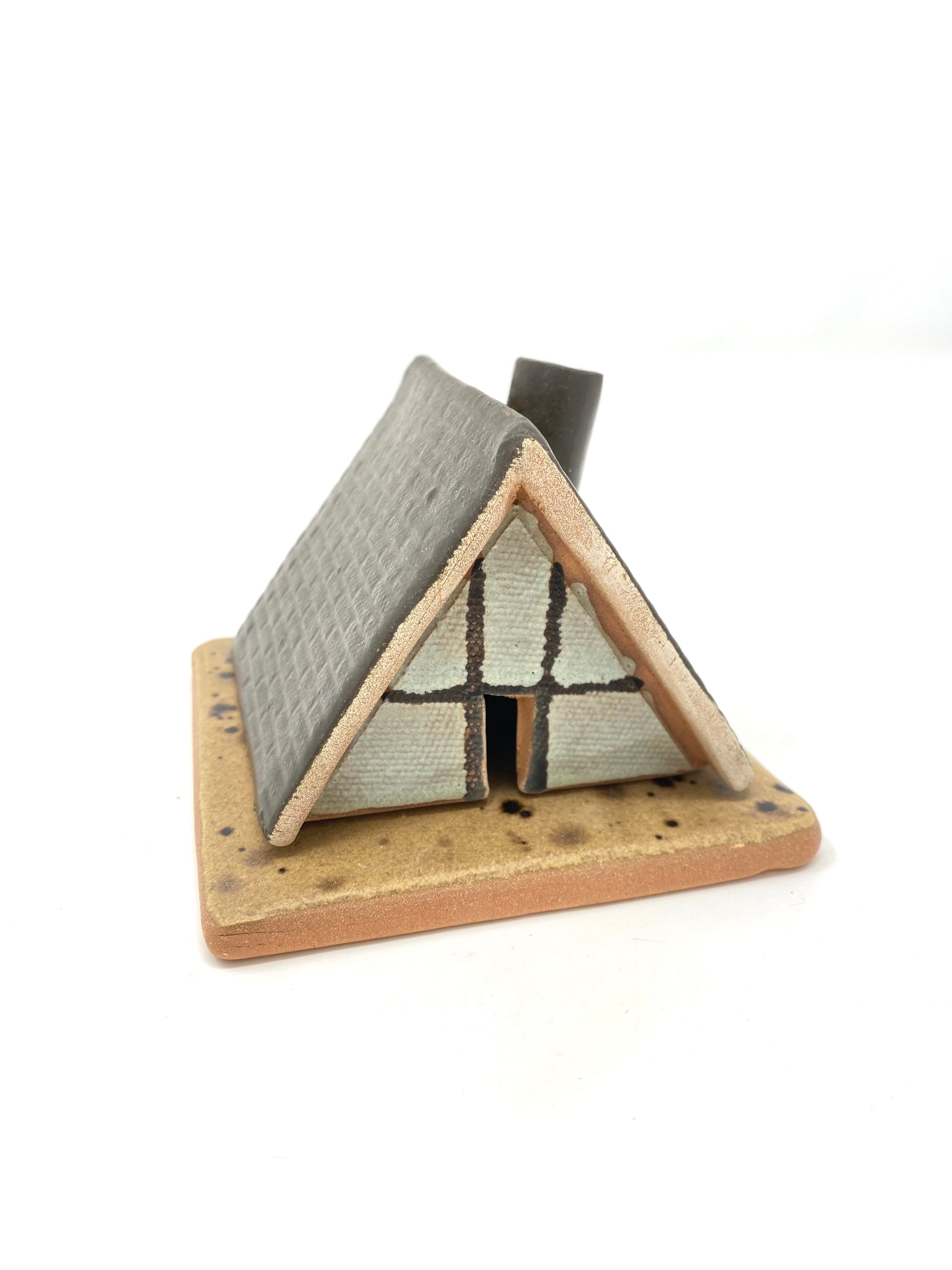 Mini terrra-cotta A-Frame incense burner. Includes cabin, base and "Forest" incense cones. Base Approximately 4" x 4" square, 3" overall height.