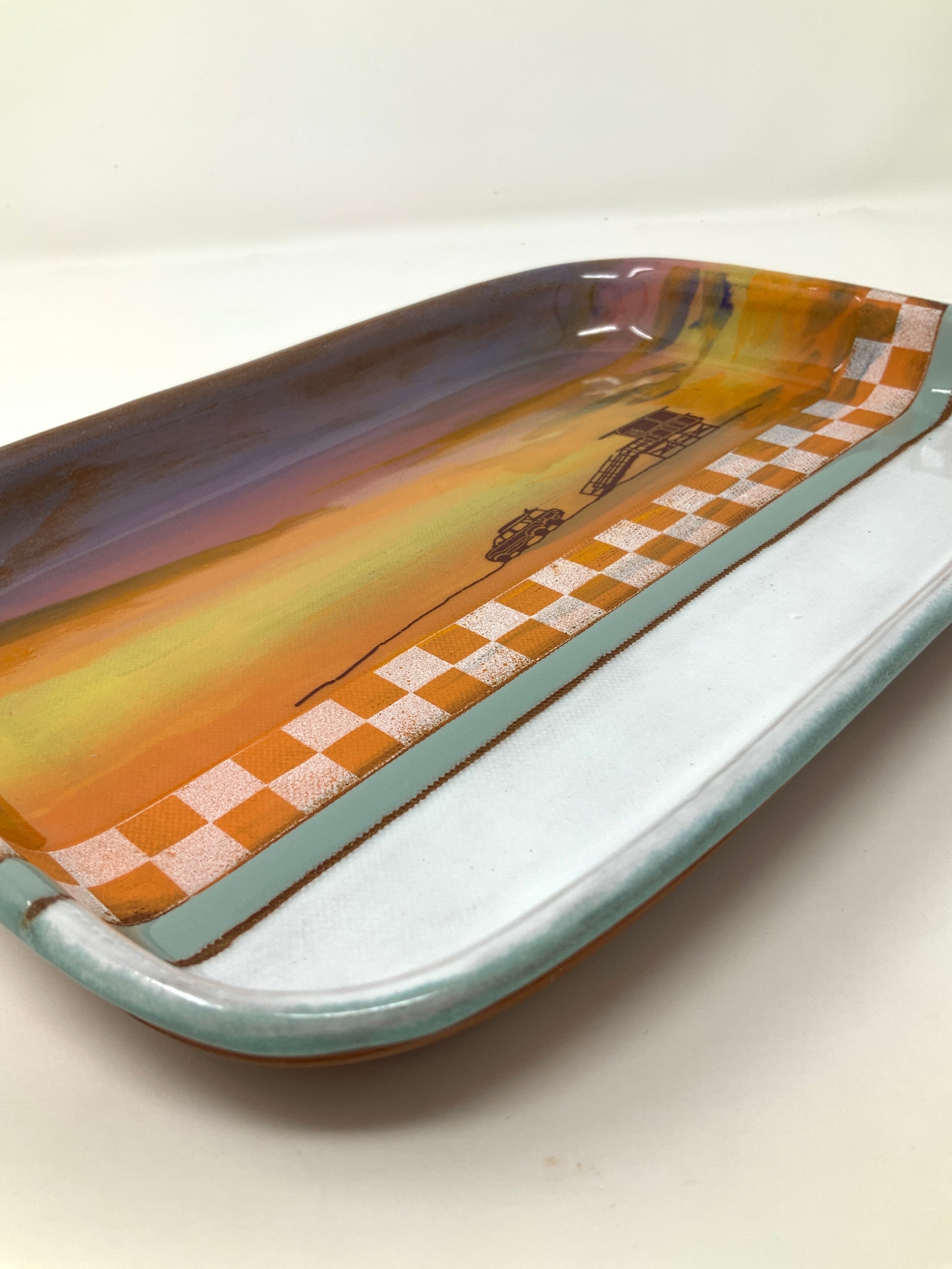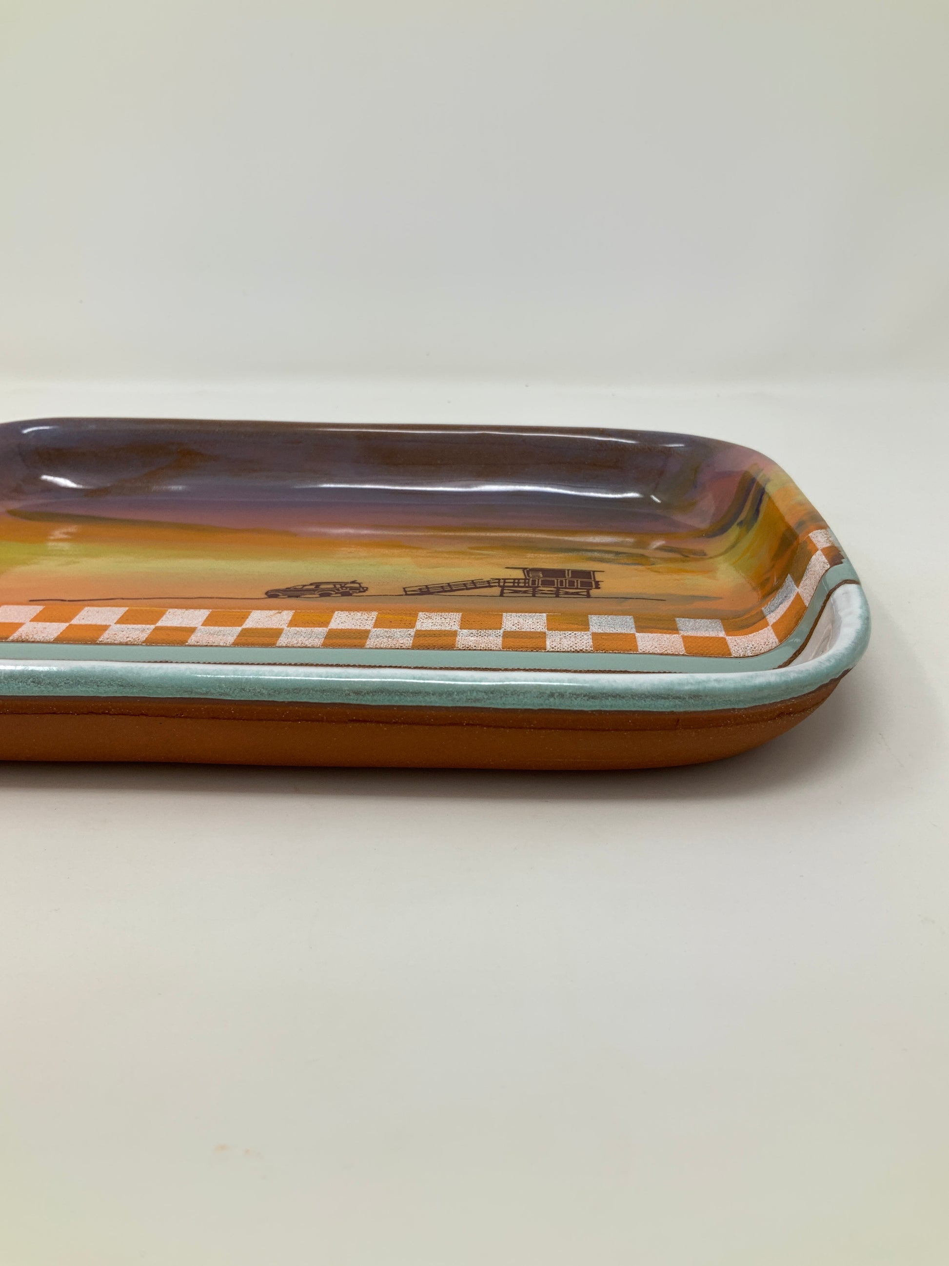 You can have a beach day any day — ssunset tray with unglazed back. Stoneware. Food safe—not for food storage. Approximately 10 3/4” wide x 7 3/4" deep x 1 1/2” H.